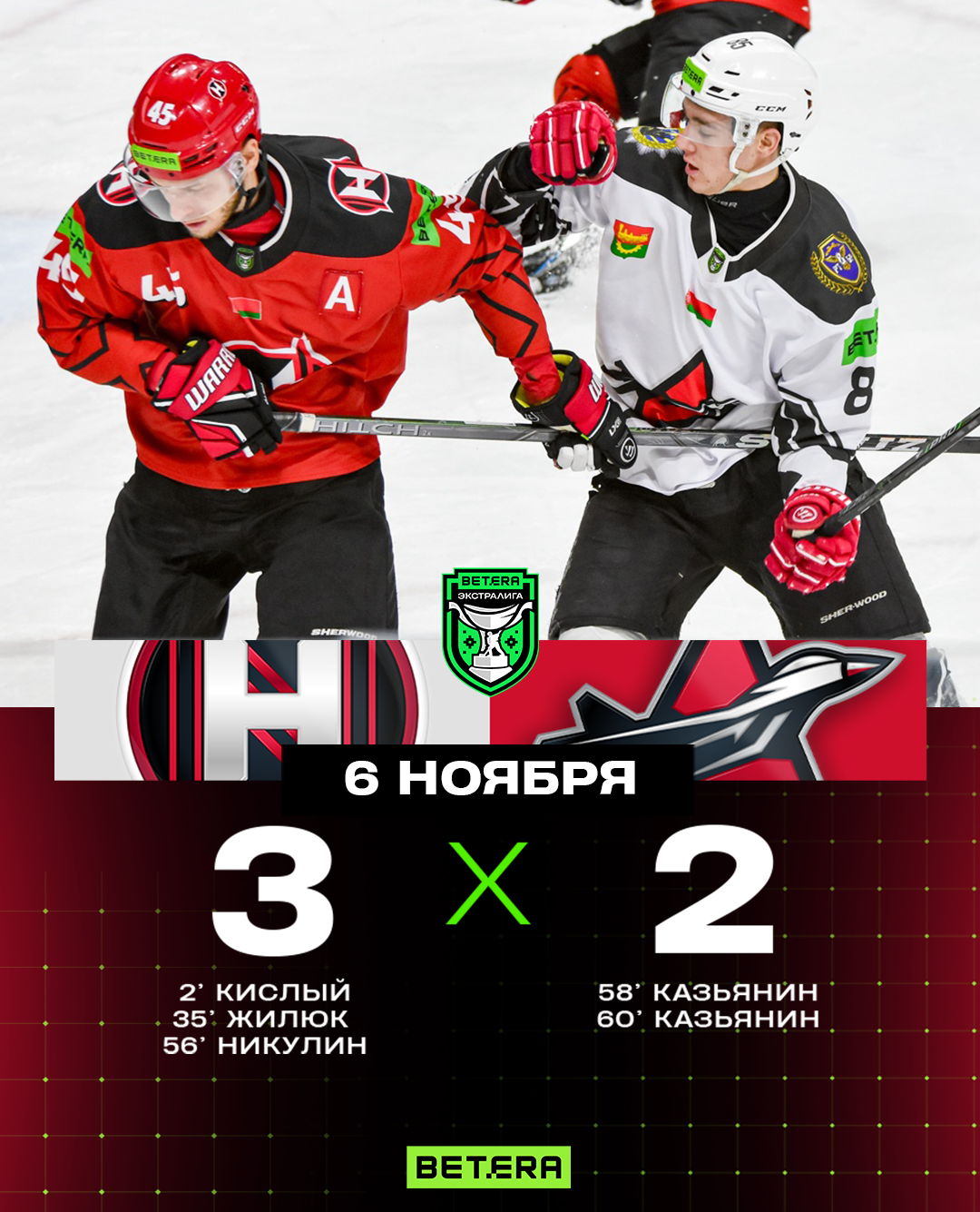 3:2 – Казьянин (Сиротин, Крылович, 59.24).