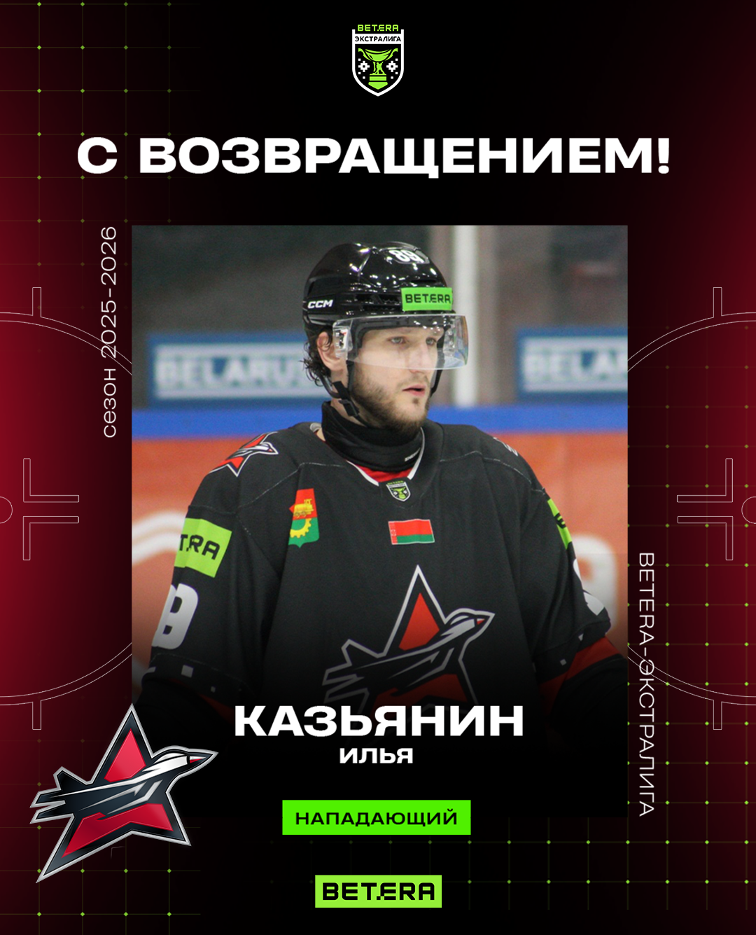 Напомним, что в сезоне-2024/25 Илья провел 34 матча в регулярном чемпионате Betera-Экстралиги в составе «летчиков», отметившись 17 (8+9) очками.