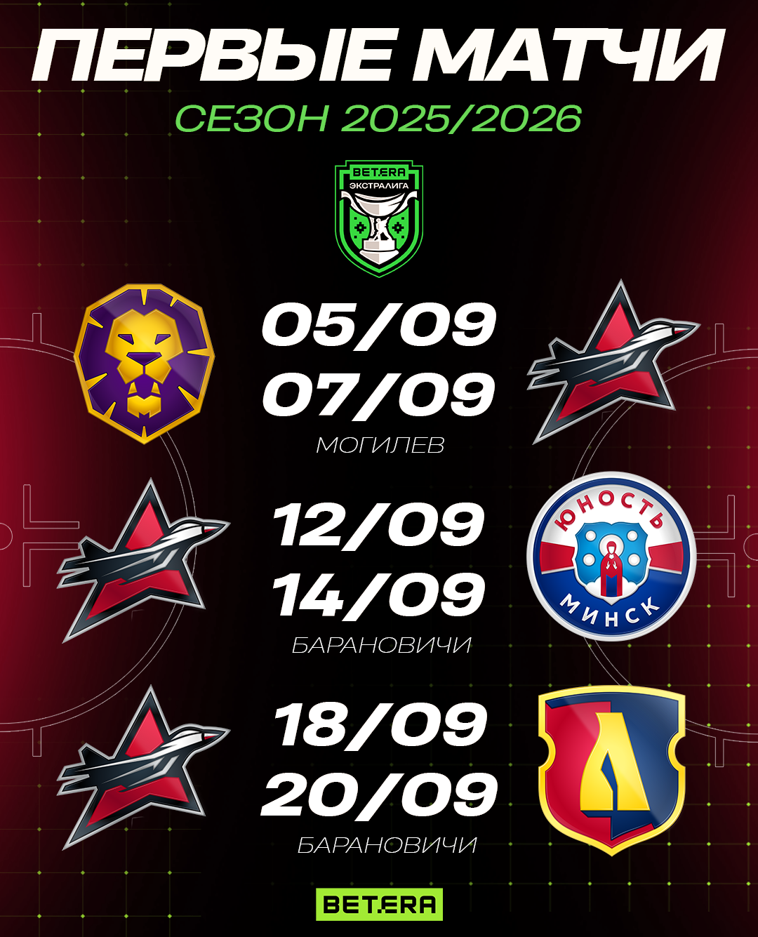 Первая домашняя серия стартует 12 сентября: в гости пожалует минская «Юность». 18 и 20 сентября также дома сыграем с «Лидой».