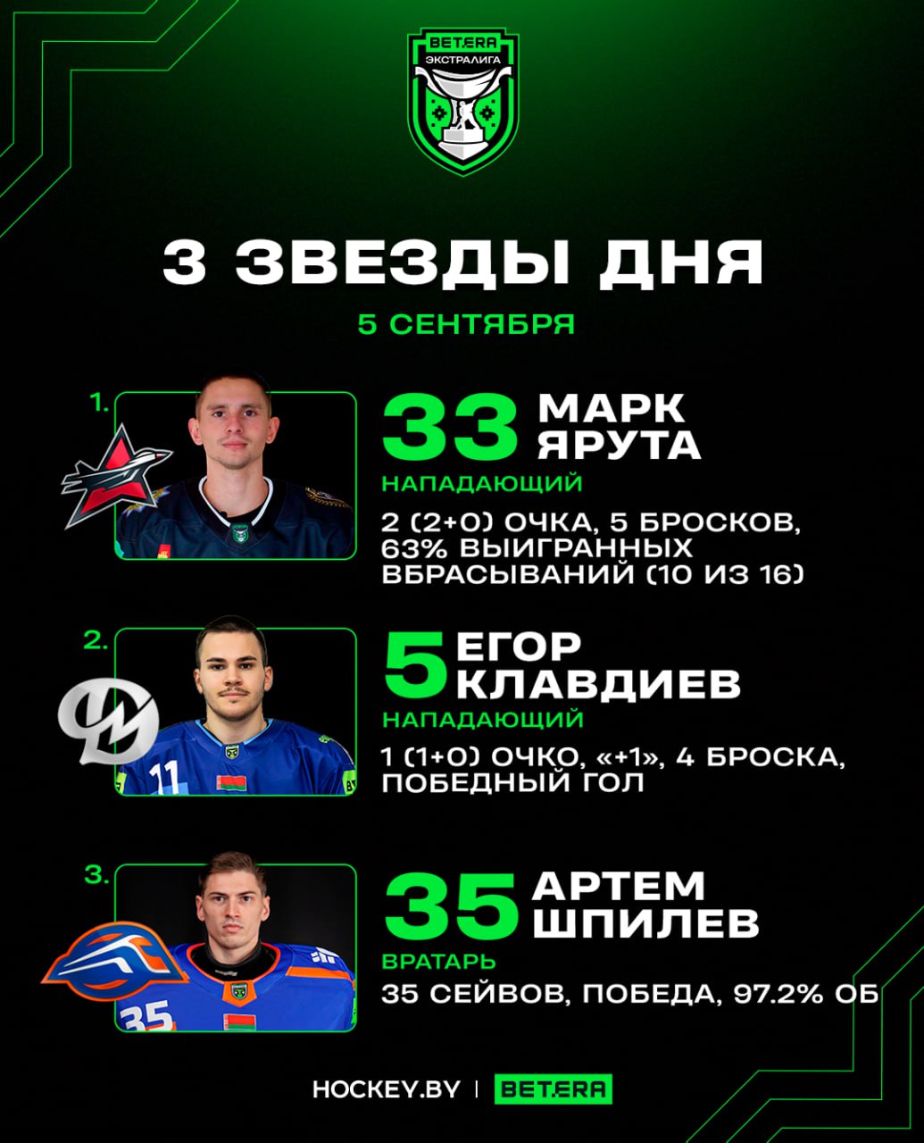 Первой звездой пятницы стал форвард «Авиатора» Марк Ярута. Он оформил дубль в ворота «Могилева» и помог «летчикам» добыть волевую победу (4:3 ПБ). Нападающий исполнил пять бросков и выиграл 10 из 16 (63%) вбрасываний.